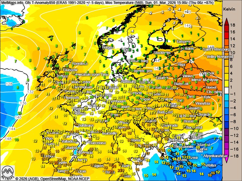 Die Temperaturabweichung Europa am Sonntagnachmittag, sowie die Wetter- / Temperaturkarten für Donnerstag-, Freitag- und Samstagnachmittag nach GFS: