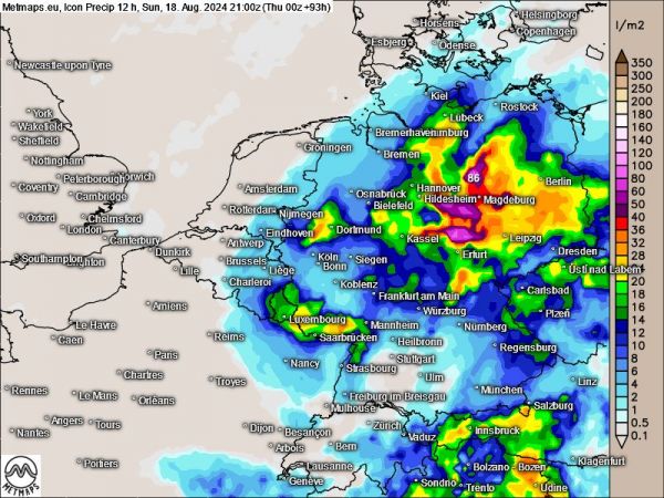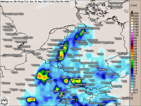 Für die westlichen Landesteile deuten nach aktuellem Stand Regenmengen von maximal 50 l/m² in 12 Stunden an; mit dem Zug über Deutschland können es gerne auch bis zu 90 l/m² in 12 Stunden sein.