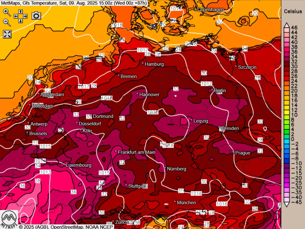 Im Westen und Südwesten kletten die Temperaturen spätestens ab Samstag auf 30 bis 32 Grad, am Oberrhein sind noch ein paar Grad mehr möglich. Kühler bleibt es im Norden mit Werten meist um 21 bis 25 Grad.