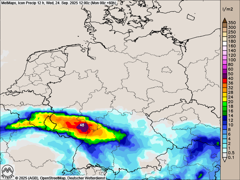 Die 12-Stunden-Regenmengen bis Mittwoch- und Donnerstagmittag (12:00 Uhr) nach ICON.