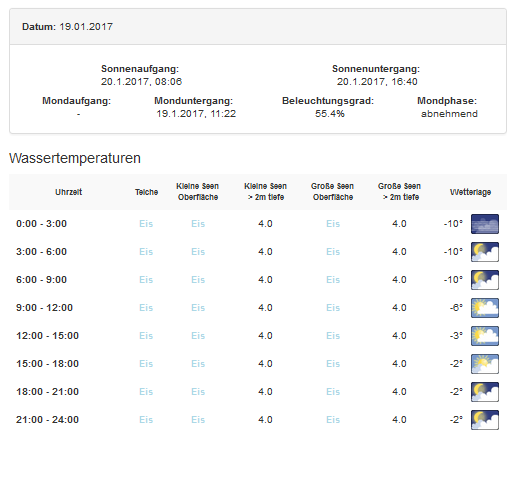 Zusätzlich umfasst unser neuer Dienst weitere für Angler relevante Daten, etwa den aktuellen Mondstand, die Sonnenauf- und Untergangszeiten sowie den Beleuchtungsgrad.