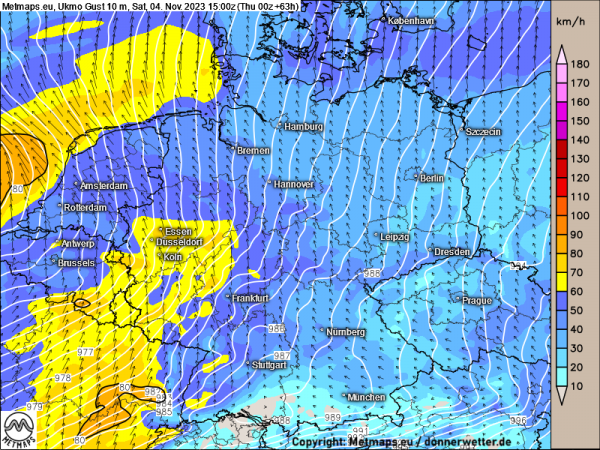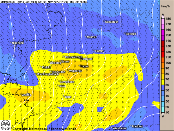 Die beiden Karten zeigen die zu erwartenden Windspitzen am 04.11. (15:00 Uhr) für Deutschland sowie speziell nochmals NRW.