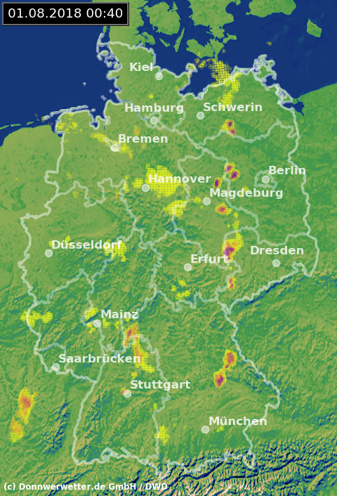 Das Radarbild zeigt aktuell von Mecklenburg – Vorpommern bis nach Bayern eine im Ansatz zu erkennende Kette mit örtlich stärkeren Schauer- und Gewittersignalen, die langsam nach Osten wandert. Auch von Frankreich können in den Frühstunden einige Regenschauer in den Südwesten unseres Landes herein ziehen. Sonst präsentiert sich der Himmel über Deutschland sternenklar oder nur leicht bewölkt.