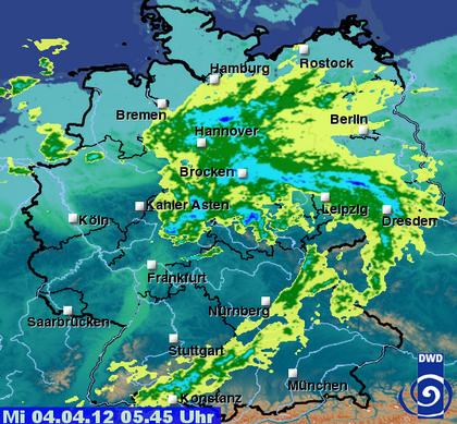 Was ist das denn? Hoppelt da tatsächlich der Osterhase über's Wetterradar? Mit dem Auge über der Lüneburger Heide und den Hinterläufen bei Dresden?