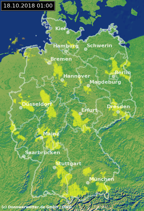Das Radarbild zeigt aktuell zwar einige schwache Signale, um Niederschlag handelt es sich hierbei aber nicht. Sonst präsentiert sich der Himmel über Deutschlands im Nordwesten eher bewölkt, im übrigen Bereich sternenklar oder nur leicht bewölkt. Vor allem im Norden haben sich vermehrt Nebelfelder gebildet.