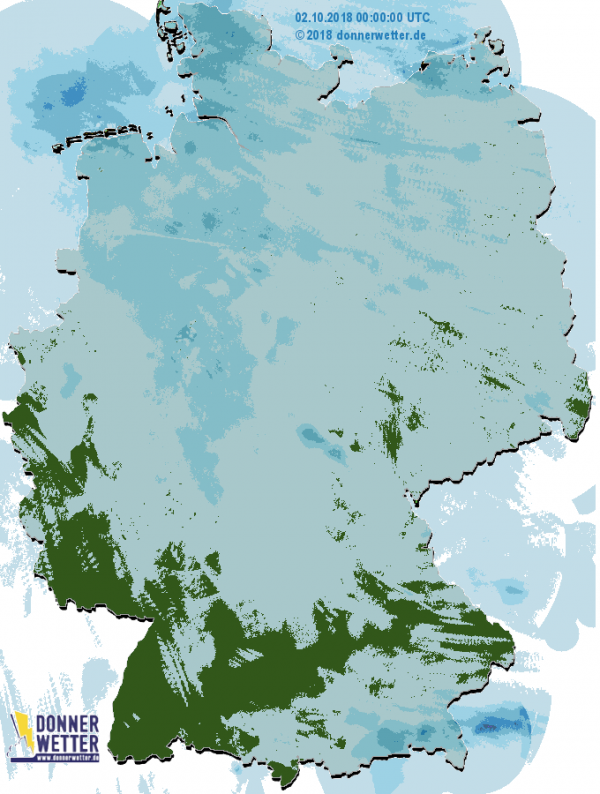Im Norden und in der Mitte fielen gestern meist zwischen 1 und 8 Liter Niederschlag pro Quadratmeter, auch im Alpenvorland regnete es in der Nacht zum 2. Oktober. Überwiegend trocken blieb es dagegen im Südwesten und rund um die Donau herum.