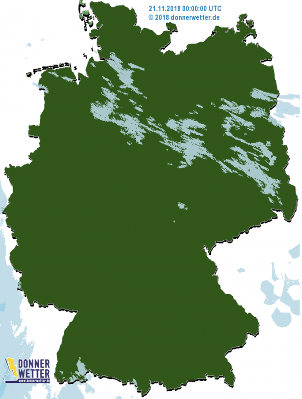 Das Radarbild zeigt aktuell einige schwache Signale. Die Signale im Norden deuten auf leichten Schneefall, Regen, oder gefrierenden Sprühregen. Aber auch in Bayern fällt derzeit etwas Regen oder Sprühregen. Sonst präsentiert sich der Himmel über Deutschland wolkenverhangen. Über den Mittelgebirgen ist es meistens neblig-trübe.