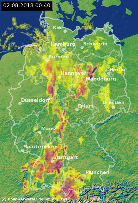 Von Freitag bis voraussichtlich Mitte kommender Woche geht es überwiegend sonnig, trocken und hochsommerlich heiß weiter. Wärmegewitter treten zwar nur regional örtlich auf, können jedoch durchaus kräftig ausfallen mit Niederschlagsmengen von stellenweise über 25 Liter pro Quadratmeter.