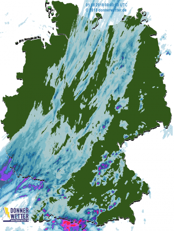 Heute tagsüber bilden sich hauptsächlich in der Südosthälfte in schwül-heißer Luftmasse einige teils heftige Regengüsse und Gewitter. Die Niederschlagsmengen können dabei auf engstem Raum wieder sehr unterschiedlich ausfallen. Vereinzelt sind mehr als 25 Liter pro Quadratmeter zu erwarten.