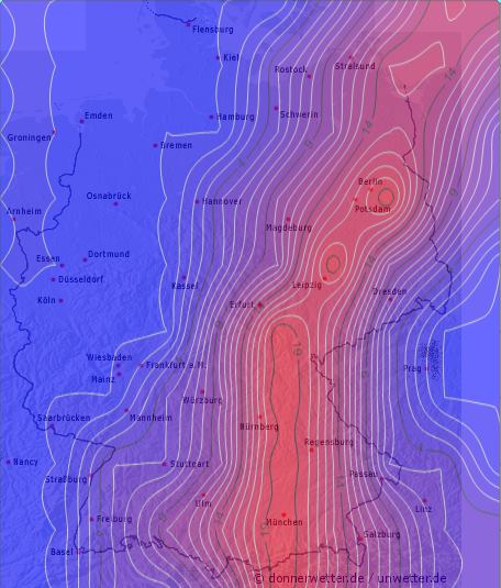 Heute kann es von der Ostsee, über die Mitte bis nach Bayern zu weiteren teils kräftigen Dauerregenfällen kommen. Dabei können regional erneut über 50 Liter Regen pro Quadratmeter fallen. In Folgedessen drohen auch weitere Überflutungen.