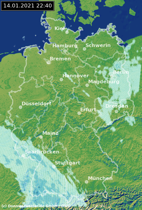 Das Radarbild zeigt von der Westeifel, übers Saarland und die Pfalz, bis zu den Alpen ein Band mit leichten bis mäßigen Signalen. Häufig fällt bis in tiefere Lagen Schnee. Auch über Sachsen und Brandenburg erkennt man schwache Signale mit etwas Schneefall, in tiefen Lagen auch Regen. Sonst präsentiert sich der Himmel über Deutschland überwiegend wolkenverhangen und nur stellenweise aufgeklart.