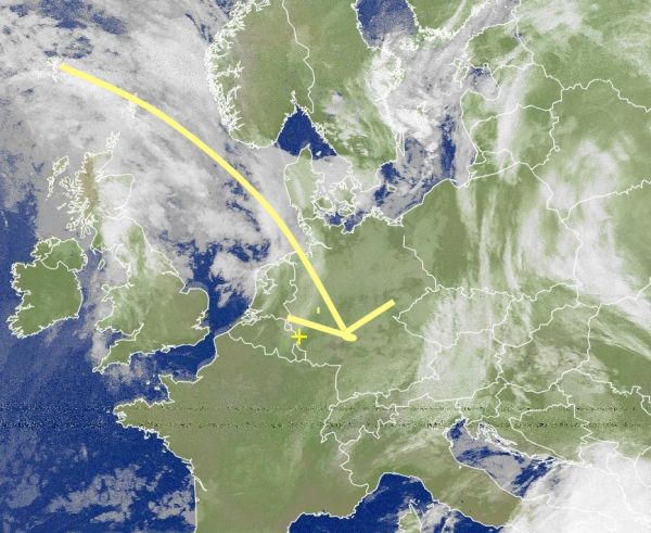 Wolken des isländischen Vulkans Bárðarbunga auf dem Weg nach Deutschland. Der Regen der letzten 24 Stunden war vergleichsweise sauer. In Bonn haben wir ein ph-Wert von unter 5 bei einem Schauer am Vormittag gemessen. Vermutlich ist Schwefeldioxid aus dem Schloten des Vulkans die Ursache des sauren Regens. Meist liegt der ph-Wert des Regens inzwischen bei 5,3 bis 5,5.