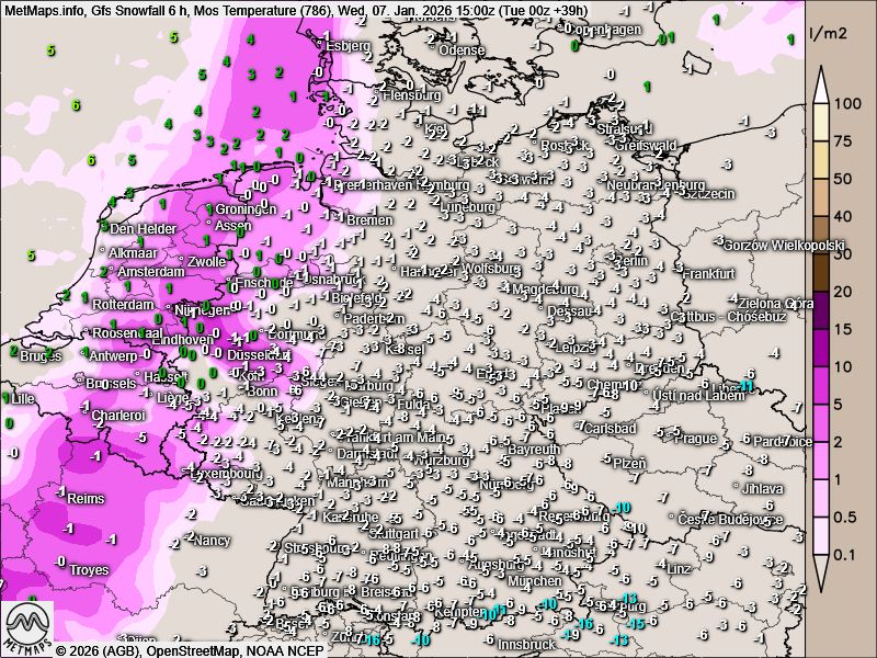 Die Sechs-Stunden-Schneemengen bis Mittwochnachmittag / Freitagfrüh sowie die Böenkarte für Freitagfrüh nach GFS:
