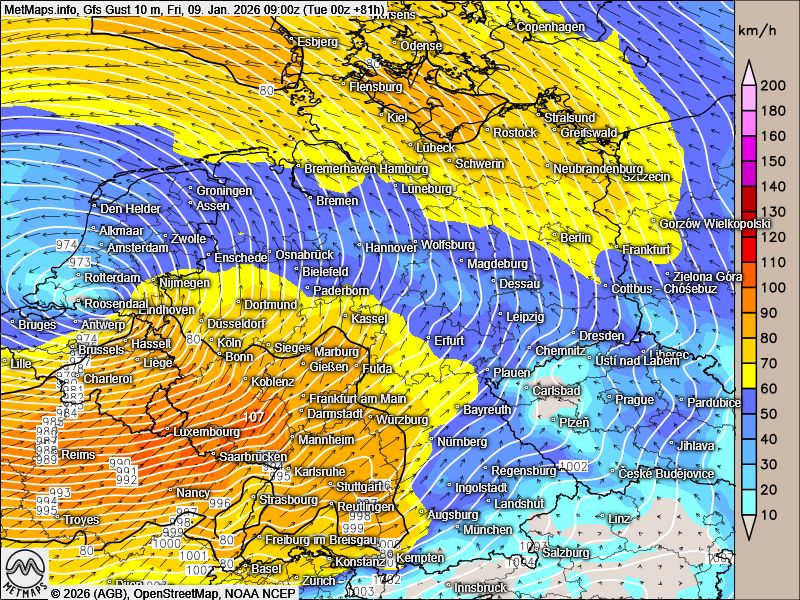 Auch der Sturm ist nicht zu unterschätzen: In Böen werden Geschwindigkeiten von bis zu 100 km/h erwartet. Grundlage dieser Einschätzung sind aktuelle Modellrechnungen (GFS), die mehrere Varianten dieses Szenarios zeigen.