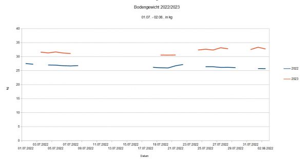 Die Grafik zeigt das Bodengewicht unseres Lysimeters in den Jahren 2022 und 2023 (jeweils 01.07. - 02.08.) in Kilogramm. Blau ist das Jahr 2022, rot das Jahr 2023 dargestellt.