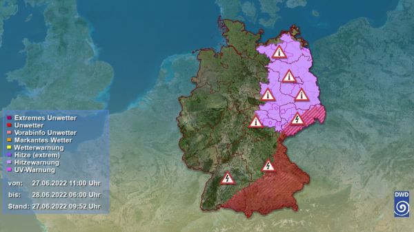 "Rebecca" und "Scarlett" - so heißen die beiden Tiefs, die in diesen Tagen unser Wetter bestimmen. Während die "Gewitterbräute" NRW und Niedersachsen bereits hinter sich gelassen haben, hier lockert es bei Werten um 20 Grad zum Abend hin auch wieder häufiger auf, steht im Tagesverlauf vor allem der schwül-heiße Osten Deutschlands im Unwetterfokus: Am Nachmittag können sich hier regional Gewitter entladen, mit im Gepäck auch möglicher Sturzregen, Hagel und Sturmböen.