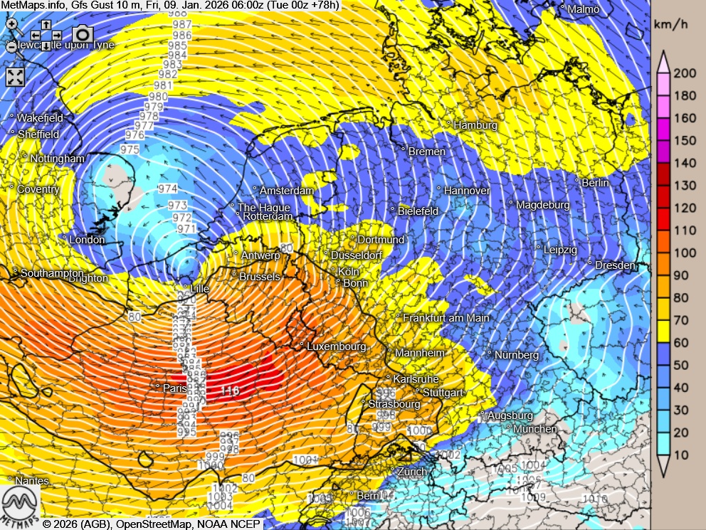 Parallel dazu stellt der Wind ein erhebliches Risiko dar: An der Nord- und Ostseeküste sind Sturmböen bis etwa 100 km/h möglich, in exponierten Lagen sogar darüber. Lokale Spitzen von bis zu 115 km/h können aktuell nicht ausgeschlossen werden.