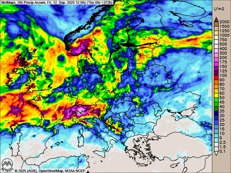 Vor allem die Berge im direkten Anströmungsbereich bekommen reichlich Niederschlag ab – die Karte zeigt die akkumulierten Regenmengen bis Freitag, 12.09.2025 nach GFS.