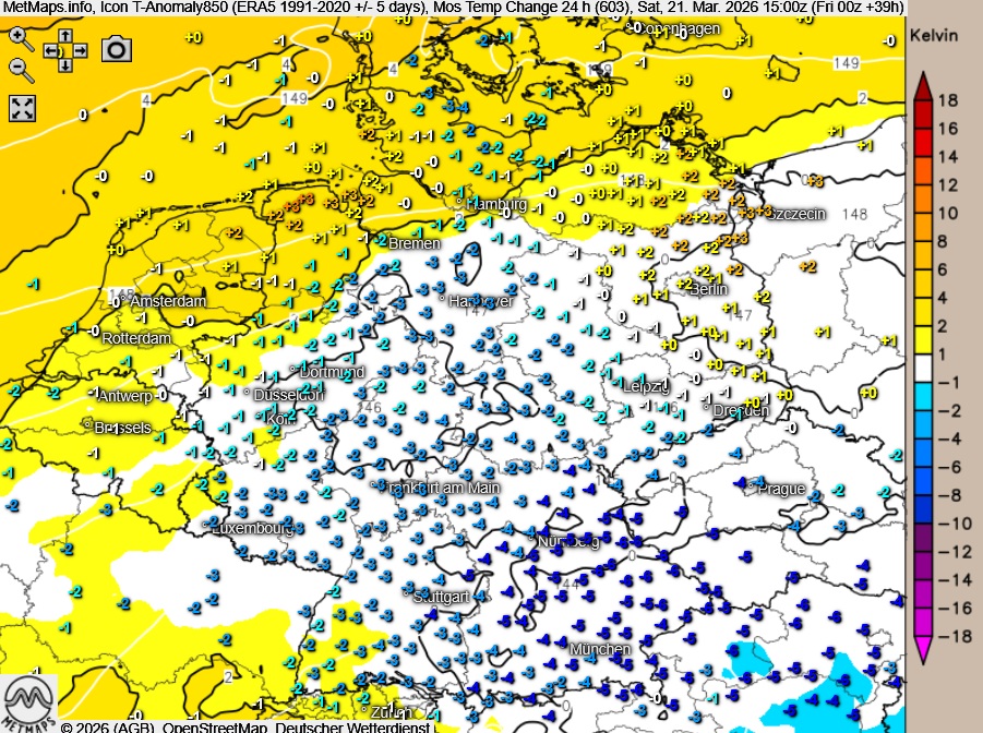 Die Wetterkarte und die Temperaturanomalie mit der 24-Stunden-Temperaturabweichung um 15:00 Uhr (ICON)