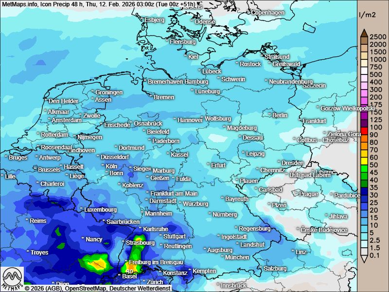 Die Wetter- / Temperaturkarte für Dienstag- und Donnerstagmittag (12:00 Uhr) sowie die 48-Stunden-Regenmengen bis Donnerstag, 03:00 Uhr nach ICON: