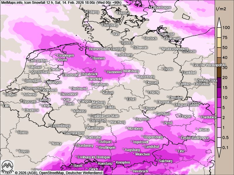 Die beiden folgenden Karten bilden die 12-Stunden-Schneemengen nach ICON (Samstag, 06:00 bis 18:00 Uhr) und die 24-Stunden-Schneemengen für Rosenmontag nach GFS ab.