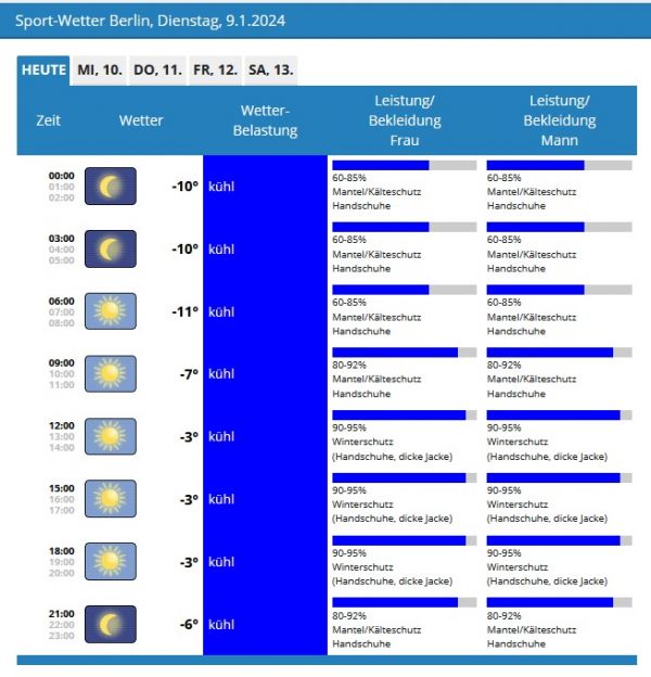 Über das donnerwetter.de-Sportwetter, welches Sie nach der Eingabe Ihrer Postleitzahl auswählen können, finden Sie neben einer Einschätzung der Wetterbelastung auf den Körper zudem eine geschlechtergetrennte Kleidungsempfehlung - und das nicht nur für den aktuellen Tag sondern sogar vier Tage im voraus.
