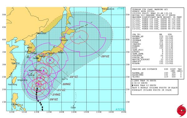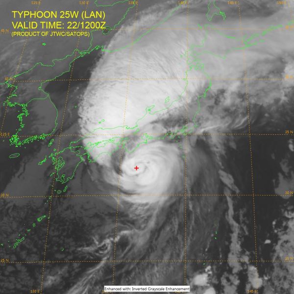 Wie angekündigt hat Typhoon Lan nun Japan erreicht. Er wird morgen über Tokio hinweg ziehen. Es drohen sich Regenmassen  zu ergießen (bis zu 150 l/m2) und starker Wind. Schon jetzt sind zig  Todesopfer zu beklagen. Es besteht natürlich auch Gefahr für die Nuklearanlagen im Land.