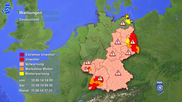 Die letzten starken Gewitter sind in Brandenburg und Sachsen zu erwarten. Lokale Gewitter drohen noch in Baden-Württemberg, RP, Südhessen und Bayern bis zum Abend. Kontrollieren Sie die Wetterlage hier bei Donnerwetter.de ständig. Nach 20-22 Uhr beruhigt sich die Wetterlage im ganzen Land zögernd.