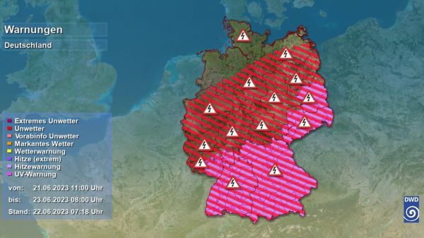 Im Süden treffen die Gewitter zudem auf extreme Hitze – aktuell liegen die Temperaturen in Bayern, Franken und dem Maintal stellenweise bei 35 Grad und mehr. Bis mindestens heute Abend, möglicherweise sogar bis in die Nacht hinein, wird uns die Unwetterlage heute noch beschäftigen. Morgen zieht der Regen dann langsam raus, am Wochenende ist nach dieser brodelnden Unwetterlage dann endlich Durchatmen angesagt.