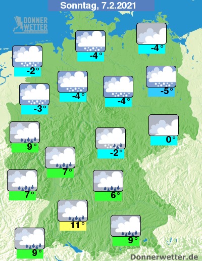 Die Temperaturspanne reicht von Höchstwerten um -5 Grad in der Märkischen Schweiz, -2 Grad in Frankenv und 7 Grad an der Saar bis hin zu 11 Grad auf der Schäbischen Alb.