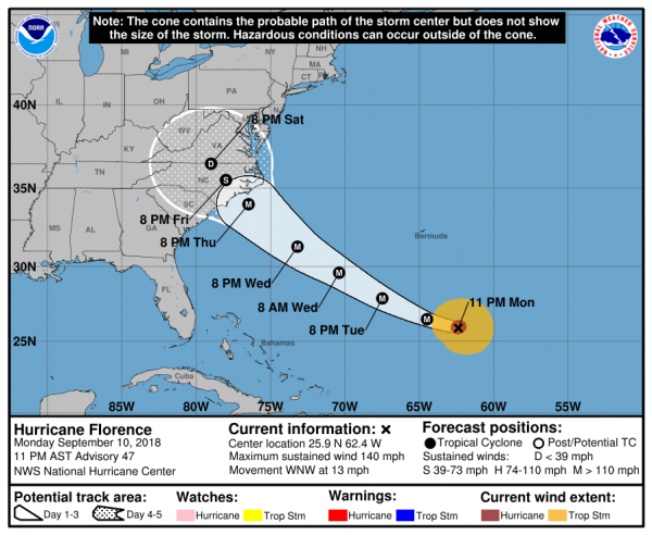 Das nationale Hurrikanzentrum (NHC) stuft "Florence" als extrem groß und gefährlich ein, akutell wird der Wirbelsturm in der zweithöchsten Kategorie 5 der Saffir-Simpson-Hurrikan-Skala eingeordnet. Experten befürchten den schwersten Wirbelsturm seit 30 Jahren an der US-Ostküste.