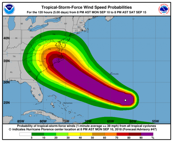 Die folgende Grafik zeigt die voraussichtliche Zugbahn von "Florence". Erstmals auf Festland trifft der Sturm demnach am kommenden Donnerstagabend (AST). Besonders betroffen wäre zunächst die Küste North Carolinas.