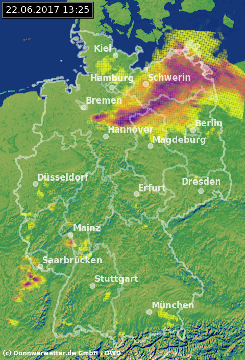 Südostwärts ziehend hat die Unweterfront nun auch den Osten Niedersachsens sowie den Norden Sachsen-Anhalts und Brandenburgs erreicht. Voraussichtlich ab 14 Uhr werden die Unwetter auch Berlin erreichen. Erste Gewitter sind zudem bereits in Teilen von NRW und Rheinland-Pfalz sowie dem Saarland aktiv.