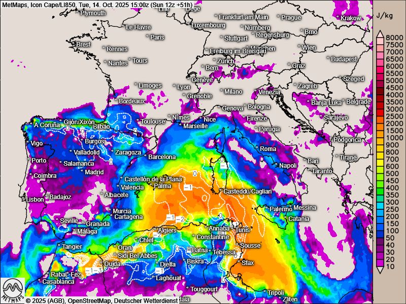 Ein kleiner Kaltlufttropfen zieht über die Balearen nach Sardinien und Sizilien.