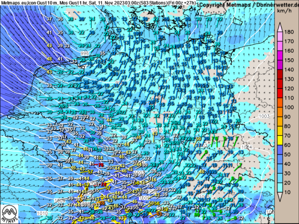 Die Karte zeigt die zu erwartenden Spitzenwindböen am Samstagmorgen (03:00 Uhr).