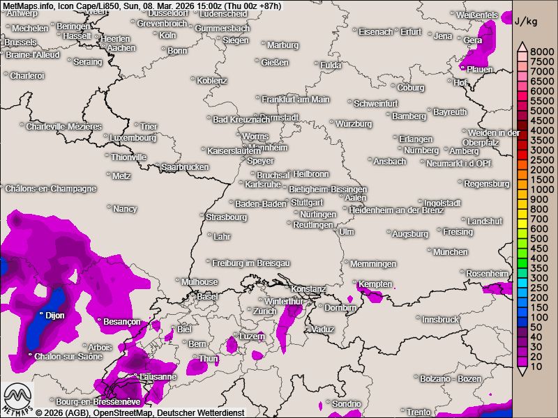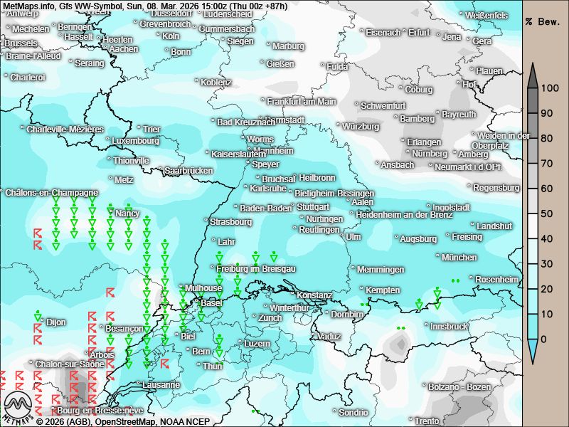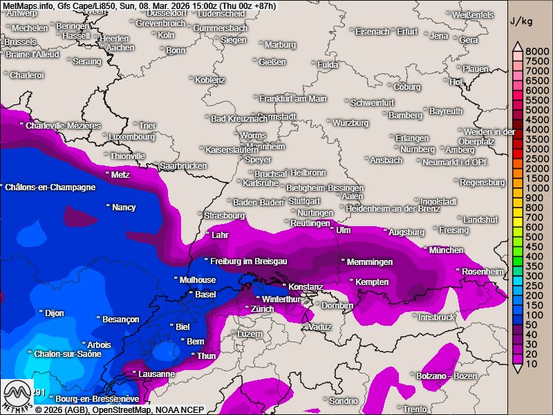 Das US-Modell rechnet für Sonntag mit zunehmender Instabilität, die vor allem am Nachmittag erste Schauer bringen könnte – insbesondere über dem Schwarzwald und der Schwäbischen Alb.