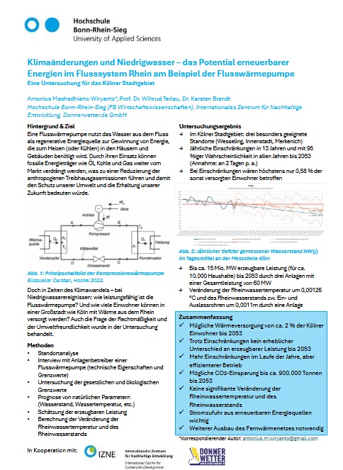 ein Interview mit einem Anlagenbetreiber einer Flusswärmepumpe (technische Eigenschaften und Grenzwerte) und eine Untersuchung gesetzlicher und ökologischer Grenzwerte vorgenommen. Darüber hinaus eine Prognose natürlicher Parameter (Wasserstand, Wassertemperatur, etc.) angestrebt, die erzeugbare Leistung abgeschätzt und die Veränderung der Rheinwassertemperatur und des Wasserstands berechnet.