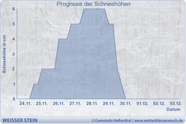 Doch auch die Mittelgebirge bereiten sich auf das erste richtige Schneewochenende der Saison vor. Auf dem Weißen Stein (700 m) in Hellenthal etwa dürften sich am letzten Novemberwochenende wieder viele rodel- und schneefreudige Besucher einfinden - eine Schneedecke von immerhin 5 bis 6 Zentimetern türmt sich hier rund um den donnerwetter.de-Wetterpark in den nächsten Tagen auf.