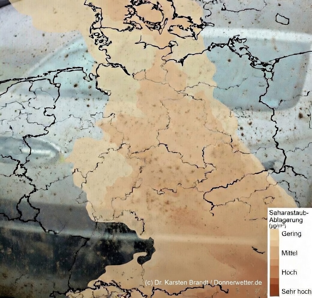 Im Süden und Südosten (Bayern, Baden-Württemberg, Österreich, Tschechien und Alpenraum) liegt noch eine nennenswerte Restmenge an Saharastaub in der Luft. Hier kann der Himmel weiterhin leicht milchig-trüb oder leicht gelblich wirken.