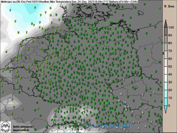 Die Karte zeigt die Berechnung (Lufttemperatur, Bewölkungsgrad, Niederschlagsform) des US-amerikanischen GFS-Modells für den 24.12.2023 (18:00 Uhr).
