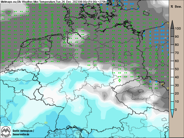 Die Karte zeigt die Berechnung (Lufttemperatur, Bewölkungsgrad, Niederschlagsform) des US-amerikanischen GFS-Modells für den 26.12.2023 (06:00 Uhr).