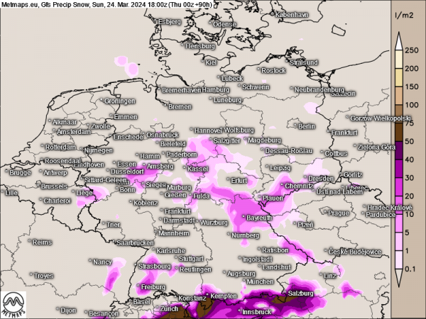 Die folgende Karte zeigt die zu erwartende Schneehöhe in Deutschland am Sonntagabend (18:00 Uhr). Eingepudert wird unter anderem der Schwarzwald, Eifel, Bergisches Land, Sauerland sowie der Bayerische Wald, Oberfranken und das Vogtland.