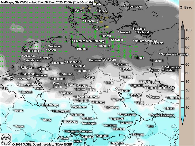 Die Wetterkarte für Dienstagmittag (12:00 Uhr), die Temperaturabweichung am Dienstagnachmittag sowie die Wetter- / Temperaturkarte für Mittwochmittag nach GFS: