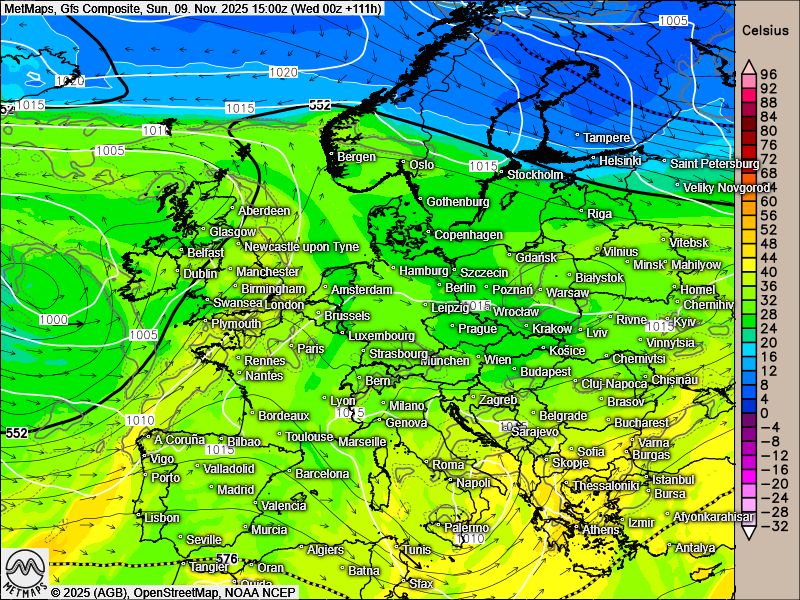 Die Strömungskarten für Samstag und Samstag sowie die Temperaturkarte für Sonntagnachmittag (immer 15:00 Uhr) nach GFS: