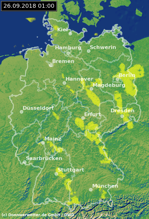 Das Radarbild zeigt aktuell zwar einige schwache Signale, diese deuten jedoch nicht auf Niederschlag. Sonst präsentiert sich der Himmel über dem Norden Deutschlands teils bewölkt, sonst verbreitet sternenklar oder nur leicht bewölkt. Im Spessart haben sich einige Nebelfelder gebildet.
