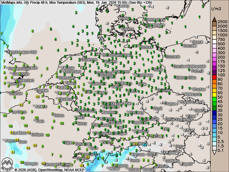 Die Temperaturen am Montagnachmittag mit den 48-Stunden-Niederschlagsmengen / Temperaturen sowie die 48-Stunden-Niederschlagsmengen bis Freitagfrüh nach GFS:
