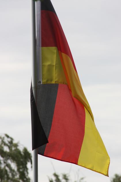 Das Hochdruckgebiet rückt von Westen näher, der Wind wird, wie die schlappe Deutschlandfahne es zeigt, zunehmend schwächer. Das Hoch bringt uns ein sonniges Augustwochenende mit Temperaturen zwischen 23 und 27 Grad C.