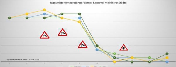Die Grafik zeigt den Verlauf der Tagesmitteltemperaturen zwischen dem 05.02. und 14.02. für Düsseldorf, Köln, Bonn und Mainz. Für alle Hochburgen gehen die Modelle ab Rosenmontag zur Zeit von Höchstwerten zwischen 0 und 2 Grad aus.