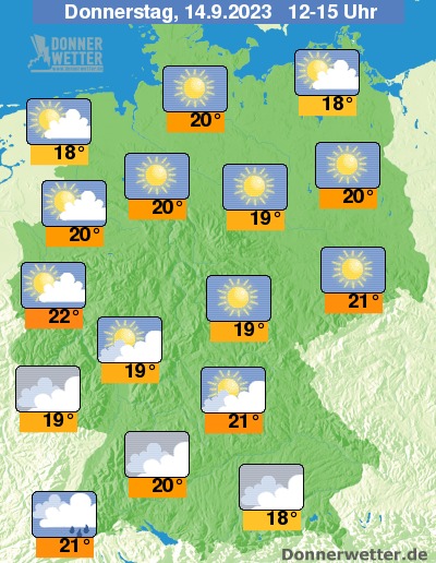 Von aktuellen Werten von verbreitet noch 30 Grad geht es am Mittwoch und Donnerstag temperaturtechnisch dann nur noch mit Werten um 20 Grad weiter; in Süddeutschland bewegen sich die Höchstwerte kurzzeitig sogar darunter (16-18 Grad).
