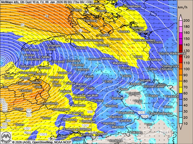 Die Böenkarte für Freitagfrüh und die 24-Stunden-Schneemengen bis Samstagnacht nach GFS: